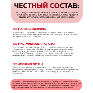 Рекомендации: для устойчивого результата принимать регулярно, без пропусков. При чувствительности начинать с 1 капсулы в день. Противопоказания: беременность, лактация, индивидуальная непереносимость. Не является лекарственным средством.