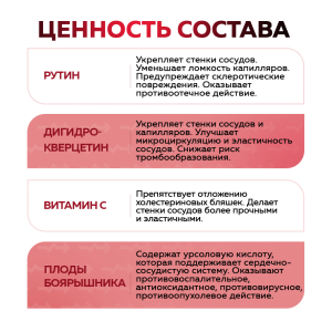 Химический состав комплекса: флавоноиды (в т.ч. рутин), полифенолы, гликозиды, органические кислоты, эфирные масла, урсоловая кислота, витамины и антиоксиданты. Все компоненты подобраны для синергетического действия на сосудистую систему.