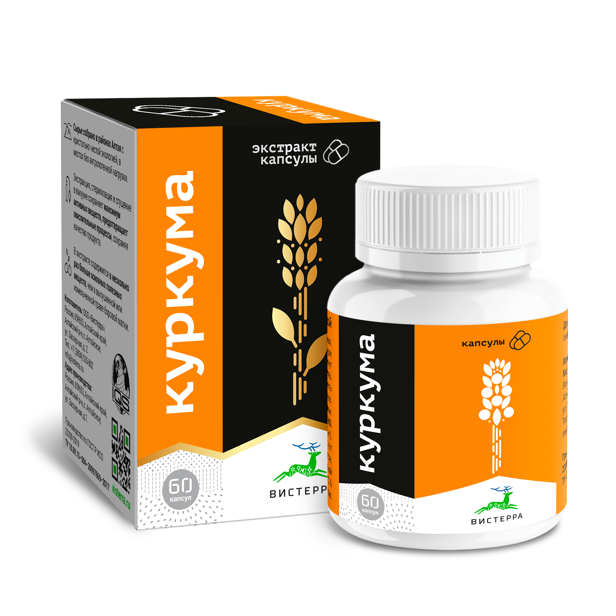 Концентрированный экстракт куркумы: активные вещества — куркумин, куркуминовые глюкозиды, эфирные масла, витамины группы В, магний, тумерон.
